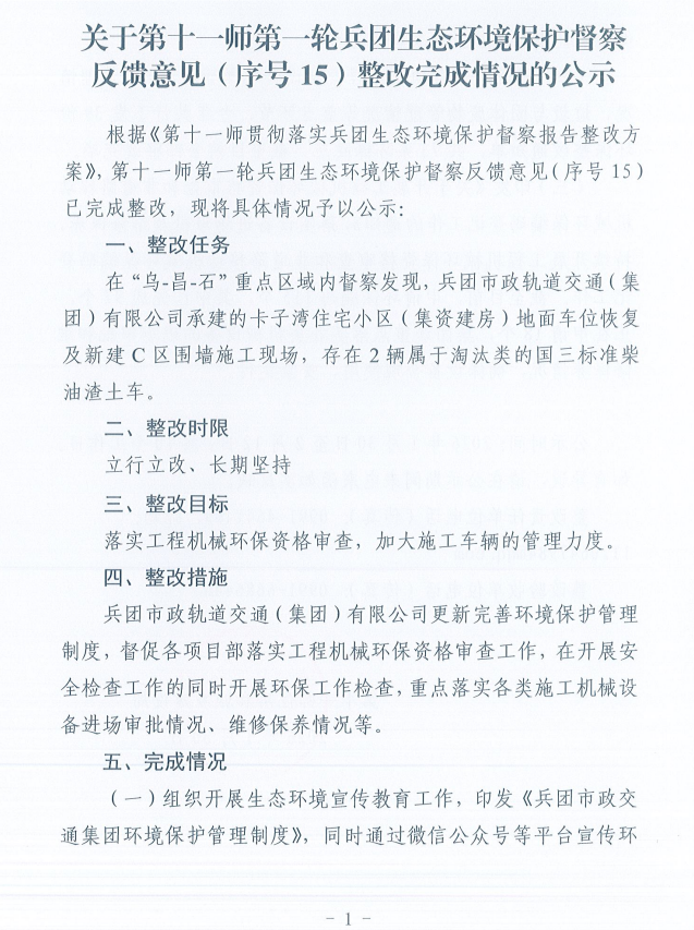 关于第十一师第一轮兵团生态环境保护督察反馈意见(序号15)整改完成情况的公示-尊龙凯时